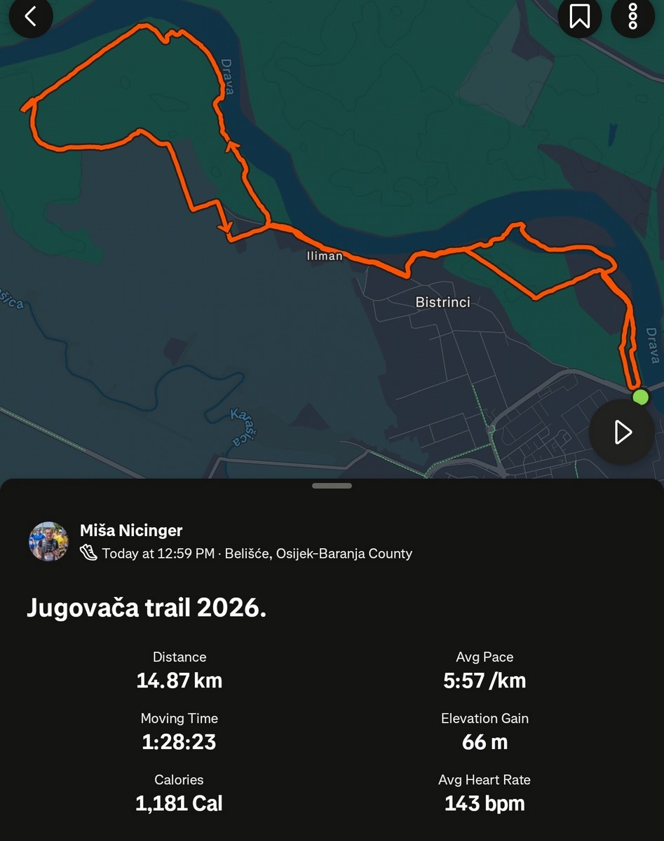 I kada pomisliš da je to – to, da ne može otkačenije, zabavnije i izazovnije, Baraberi se pobrinu da nas sve iznenade i usreće. I ove godine sam se prijavio na obadvije utrke, tj. Belišćanski cener – utrka kružnih tokova i Jugovača trail – duga staza. Cestovna utrka je standard, tu se nema što mijenjati, super volonteri, policija i ostali koji su se brinuli za našu sigurnost. Malo odmora pa pripreme za trail. Gospodin Angel nas je sve iznenadio kada je rekao da se prelazi 2 puta preko vode!? Već smo smišljali taktiku kako to izbjeći 🤣 ali kada smo došli na “mjesto zločina” vidjeli smo da povratka nema. Ugodno smo rashladili noge. 🙂 Staza je osmišljena savršeno. Ugodna za trčanje od početka do kraja, tako da velika pohvala za “zemu” i sve Barabere. – napisao je Pero Krištić