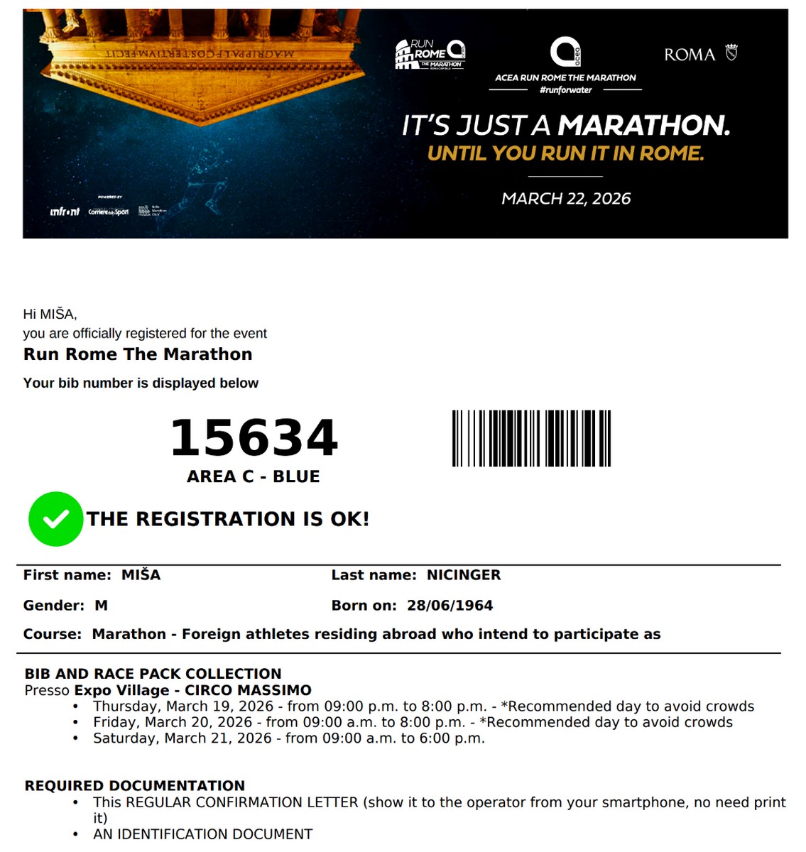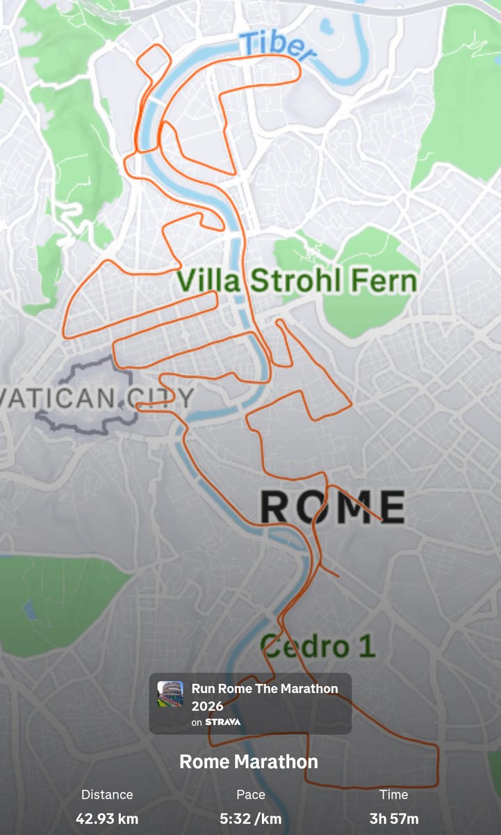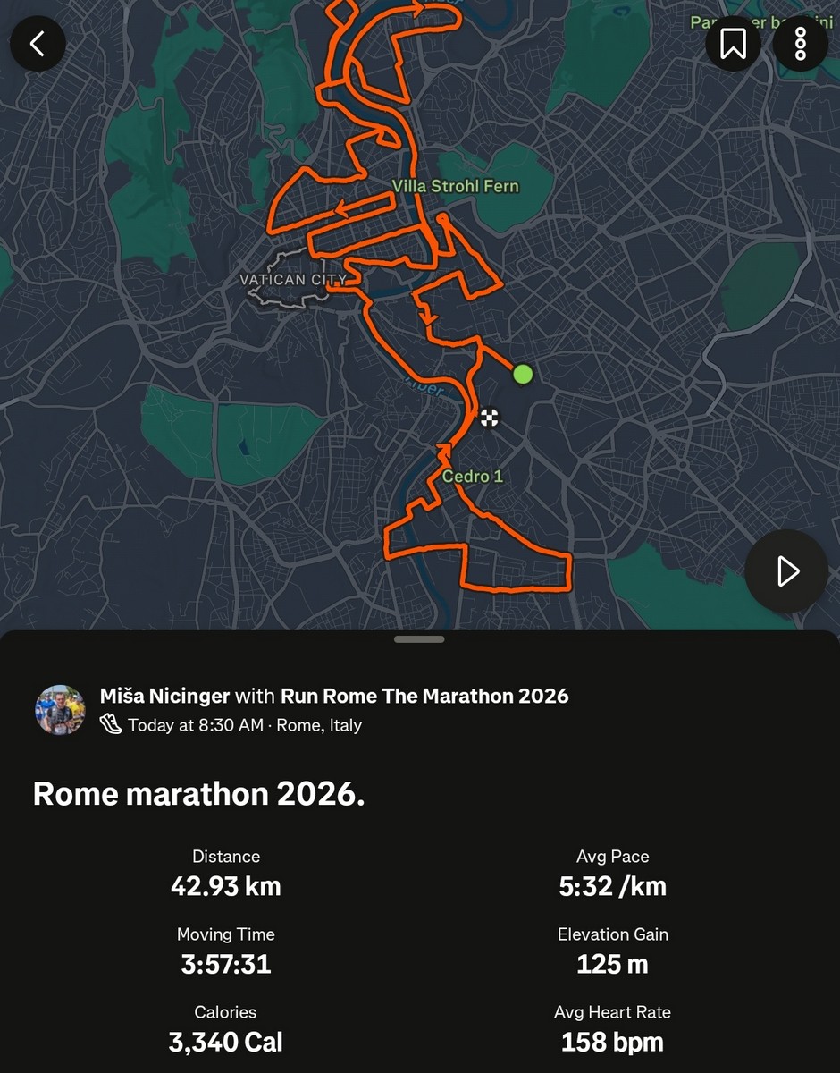 Maraton u Rimu je ispunio sva naša očekivanja i premašio ih za 10 puta. Organizacija i doživljaj bez premca. Najtoplije preporučujem odlazak na Rome marathon 2027. svima koji su ili nisu bili. Za koji dan trčimo humanitarni trail u Voćinu, a već u nedjelju je nastavak SBTL-a na jezeru Borovik. Vidimo se dragi moji.
