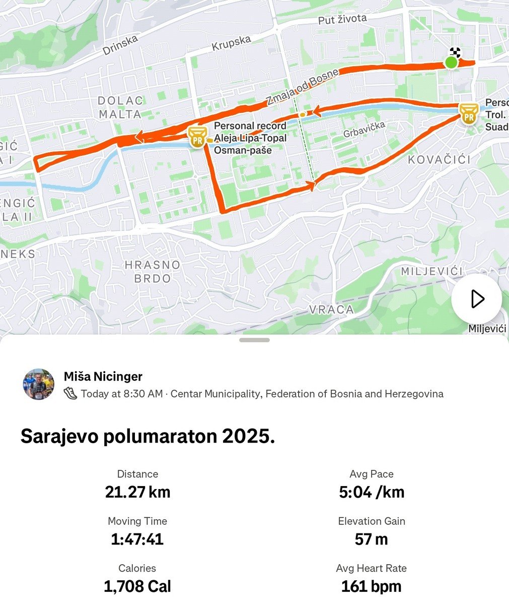 NGO Marathon Sarajevo – 18. Sarajevo polumaraton 2025. Prošle godine je to bila moja prva utrka u životu. Tih 5 km sam jedva preživio. 🙂 Ove godine, isto mjesto, isto vrijeme – samo ovoga puta 21 km tj. polumaraton. Bilo je fantastično. 🙂 Lijepo vrijeme, puno trkača, ekipa sa trail lige, jedno za drugim sve bolje od boljeg. Kao šlag na kraju sam čak uspio i postaviti svoj rekord na 21 km. 🙂 Volonteri su bili ludi k’o struja, baš pozitivni i veseli cijelo vrijeme. Nadam se da stižemo i slijedeće godine u čarobni grad Sarajevo. ❤️ – napisao je Pero Krištić